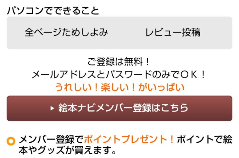 メンバー登録をしなくても絵本を買うことはできますが、買い物やレビュー投稿でポイントがもらえたり、「全ページためしよみ」などの特典がつくので、メンバー登録したほうがお得です。