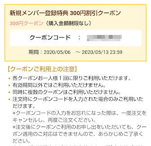 確認メールには、新規メンバー登録特典の300円割引クーポン(購入金額制限なし)がついてるので、忘れないようにブクマしておきましょう!