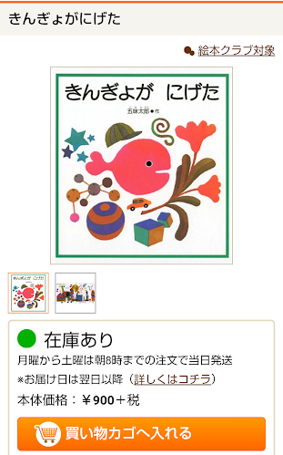 - 絵本の画像をタップ。ここで価格・在庫の有無・利用できる決済方法を確認して買い物カゴに入れる。